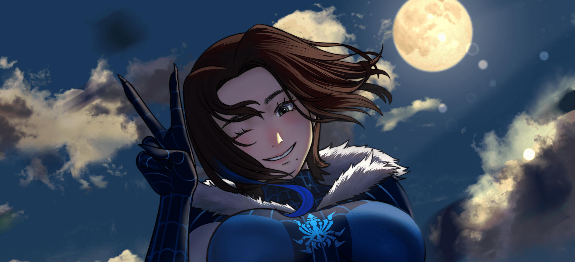 Vale was having an ordinary day in Saint Nova's bustling Central Park, where she worked as a guide/assistant, when things suddenly took a turn. An unexpected critter in the form of a friendly tarantula approached her and suddenly bit her, unexpectedly infusing Vale with spider-like powers and a strand of pure energy – The tarantula was a successful experiment created in secret by Alchemax, the test subject in infusing a living being with Lumen energy, and an escapee from their labs.The bite ended up being more than just venom; it was a catalyst, the turning point. Over the next day Vale underwent a disorienting transformation – Her senses sharpened to an unnerving degree, her reflexes seemed faster, and she felt like a persistent 'buzz' settled just beneath her skin, unaware of the pure energy now flowing through her very veins. Then came the physical changes: Immense strength coursing through her limbs, reflexes like lightning, and perhaps most unnervingly, the ability to adhere to any surface, walking up walls and across ceilings with ease.Driven by a growing sense of responsibility and perhaps a need to make sense of her unexpected transformation, Vale embraced her destiny, becoming the Azure Spider. The name seemed to fit perfectly – The striking, almost jewel-like blue of the tarantula's colors echoed in the sleek, practical suit she crafted for herself, a symbol of hope cutting through the city's verdant gardens. She dedicated herself wholly to battling Saint Nova's escalating wave of villains, becoming the city's cheerful and cheeky guardian, the agile protector swinging through the urban landscapes, the only one standing between ordinary citizens and extraordinary danger.But this amazing power came at a personal cost – The quiet, hopeful dream she shared with her beloved aunt to open a cozy botany shop began to wither. Every late-night patrol, every unexpected emergency, every moment spent tracking down a villain or recovering from a fight chipped away at the time and energy she would have invested in their shared venture. The demands of safeguarding the people she cared about – the faceless crowds she web-slung above, the innocent people of Saint Nova, and most importantly, her unsuspecting aunt – consumed her time, energy, and focus. Vale found herself trapped between the normal life she lived before and the sudden responsibility she received when she gained her powers.