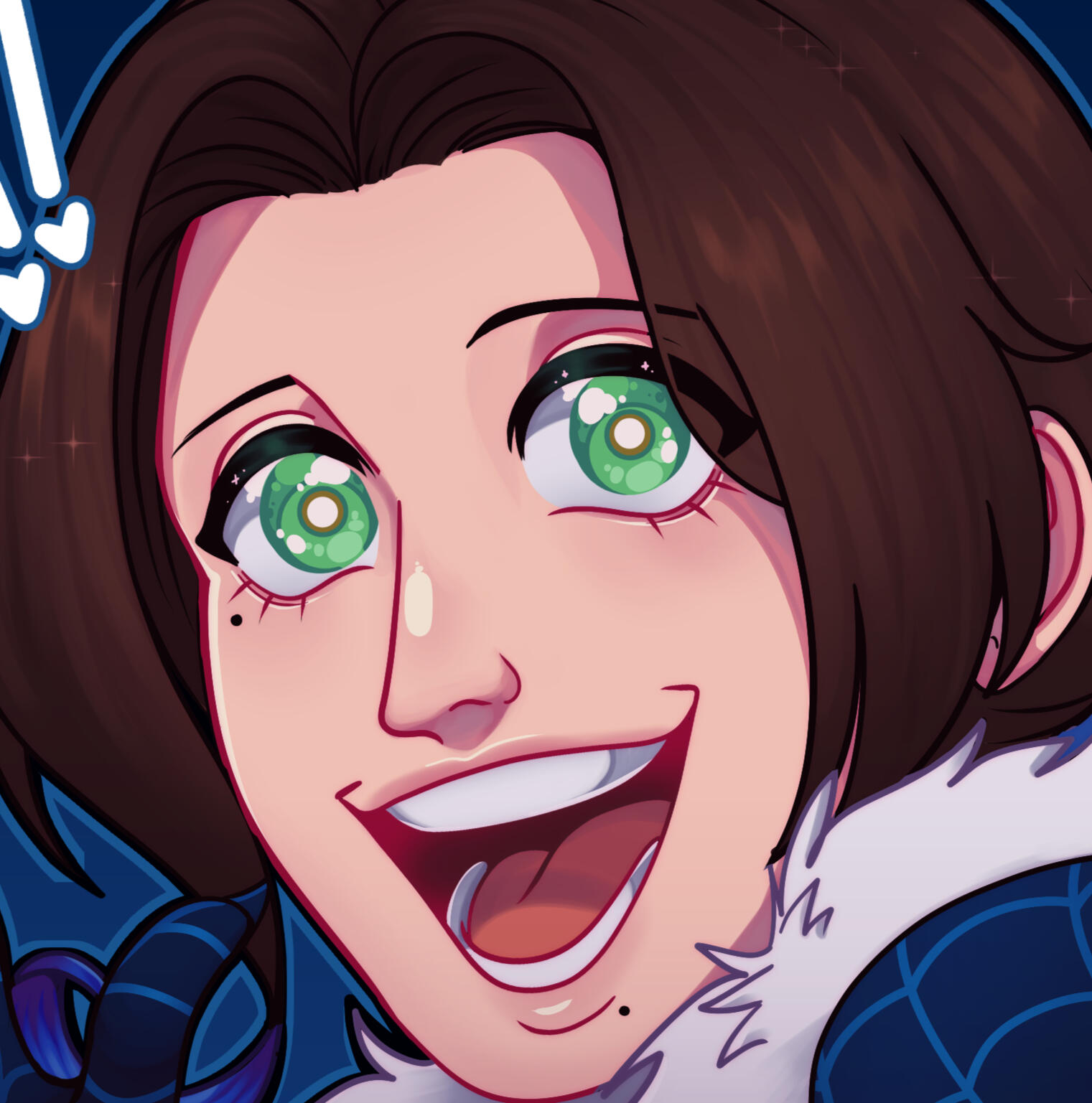 EXTRA(S): Beauty spots - one under her right eye and one on the left side of her chin ; the right side of her bangs is longer and has a streak of hair dyed electric blue ; usually keeps her hair braided and the tips of her hair are also dyed blue ; she has a golden/brown ring around her pupils