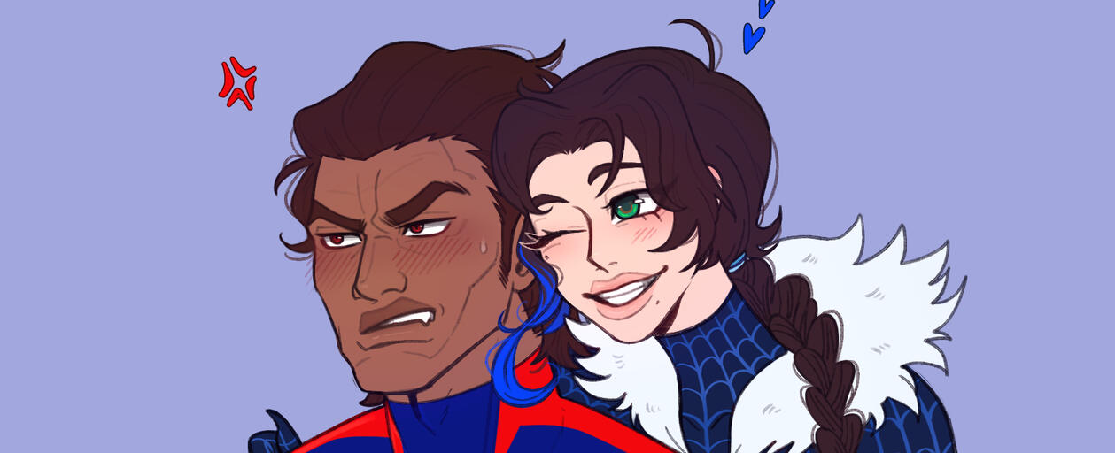 In the vast tapestry of the Multiverse where countless realities weave together two individuals stand at the nexus of an unlikely but deep relationship: Miguel O'Hara, the formidable and often brooding leader of the Spider-Society, and Vale, the vivacious and empathetic Azure Spider from Earth-8979. Burdened by the crushing weight of maintaining order in the Multiverse, Miguel carries the scars of guilt and immense personal loss and the isolating responsibility of his position - His existence is defined by duty, stoicism and a self-imposed emotional detachment designed to protect not just the Multiverse but also his own vulnerable core from further pain. He is a figure of immense power, yet profoundly alone, a sentinel against interdimensional chaos. Acting as a striking opposite Vale embodies a vibrant, almost chaotic energy - She is a whirlwind of cheerfulness, good humor, and a uniquely Brazilian zest for life, treating almost everyone she encounters with open warmth. Beneath her effervescent exterior, however, lies a poignant struggle with profound loneliness, and despite her outward extroversion Vale yearns for deep, genuine connections, often finding herself isolated even amidst the bustling energy of her own dimension. Her transformation into the Azure Spider, imbued with unique powers and a selfless dedication to protecting her home, ultimately led her to the Spider-Society, a place where she finally began to feel a sense of belonging.It was within the sprawling hub of the Spider-Society Headquarters that the two contrasting forces collided - One marked by a struggle with intense loneliness and the other by the heavy burden of self-imposed isolating responsibility, unexpectedly converging to forge a vital, deep connection, ultimately leading up to a mutual emotional growth and a burgeoning romantic bond.